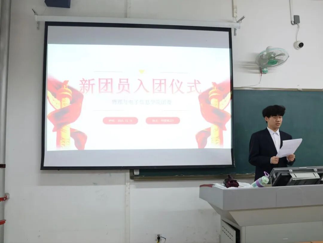 为增强新团员的身份认同感与责任感,引导新团员坚定理想信念、践行使命担当,12月16日,物电学院在明理楼223教室举行新团员入团仪式。