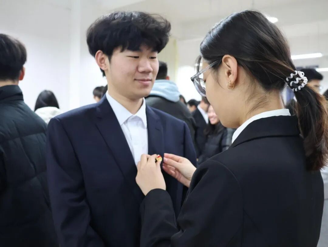 活动伊使,主持人宣读新团员名单,共有18名同学经过严格程序,正式加入中国共产主义青年团。随后,现场举行了团徽佩戴环节,由各位老团员代表逐一为新团员佩戴团徽。