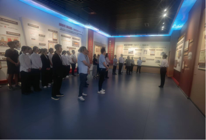 师生党员在教育馆尾厅内重温了入党誓词。面对鲜红的党旗,大家高举右拳,庄严宣誓,铿锵有力的誓言在展厅内回荡,感悟初心使命。