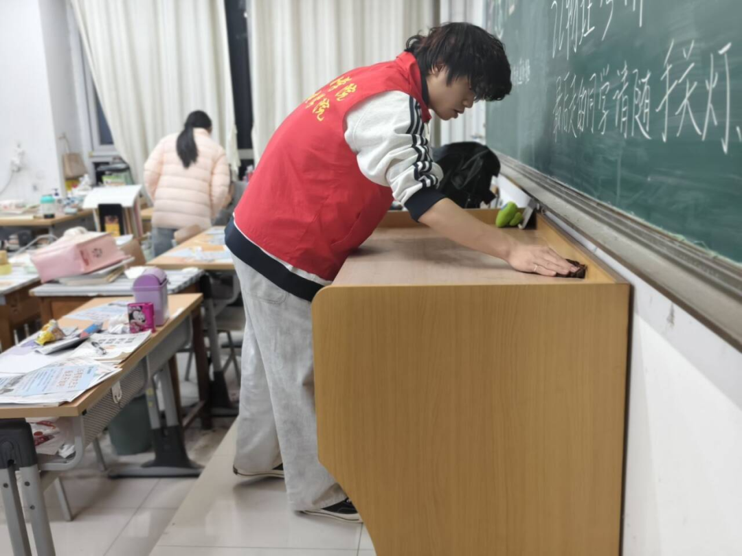活动前,学院提前划分责任区域、明确分工,志愿者们携带清扫工具准时集结,以饱满的热情投入到服务中。清扫过程中,志愿者们分工协作、默契配合:有的仔细擦拭桌椅表面的灰尘与笔迹,有的认真清理地面的纸屑与杂物,有的规整散落的书籍资料,有的对门窗、墙角等卫生死角进行重点清扫。大家不怕脏、不怕累,不放过任何一处细节,经过数小时的辛勤劳作,考研教室的桌椅摆放整齐有序,地面干净整洁,整体环境焕然一新,为备战考研的学长学姐们打造了窗明几净的学习空间。期间,不少路过的考研学子对同学们的暖心举动表示感谢,现场洋溢着互助友爱的温馨氛围。