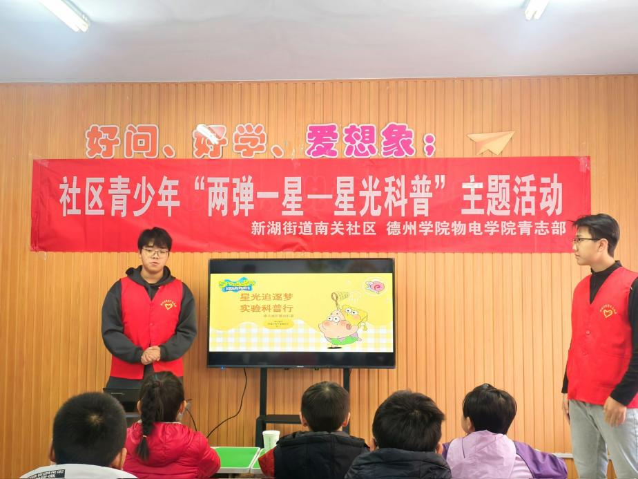 为普及科学文化知识,培养青少年的科学素养与实践能力,弘扬“两弹一星”精神,12月7日,物电学院“星光”科普志愿服务队在南关社区开展“星光追逐梦·实验科普行”主题科普活动。