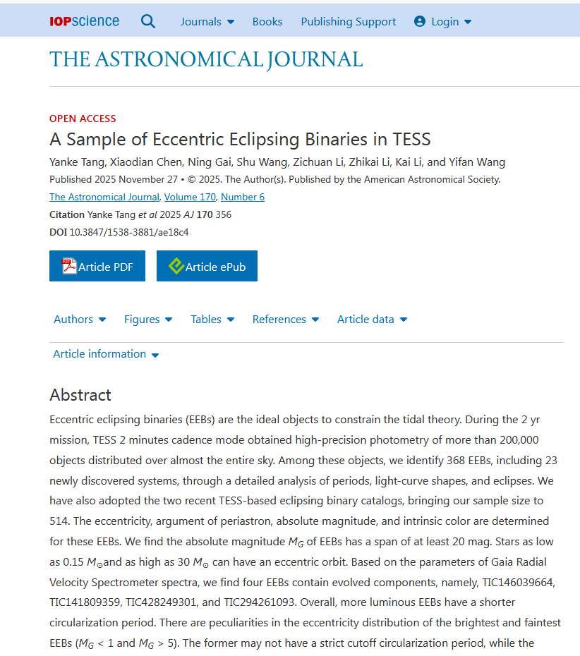2025年11月27日,永乐高60net唐延柯教授团队在国际天文权威期刊《The Astronomical Journal》上发表研究成果。该团队综合使用空间望远镜TESS两年的数据集,以2分钟采样模式获得了几乎覆盖全天区的20多万个天体的高精度测光数据,利用差分等方法建立了识别偏心双星的Pipeline。基于该Pipeline对所有天体的周期、光变曲线和食现象进行详细分析,共计识别出368颗偏心双星,其中包括23个新发现的偏心双星。同时利用建模等方法详细计算了这些偏心双星的偏心率并构建了最大的偏心双星样本库。