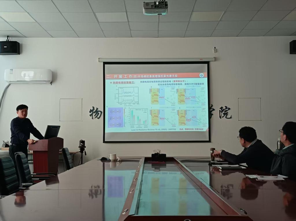 张超教授以《表面增强拉曼光谱调控研究》为题开展学术报告。系统介绍了表面增强拉曼光谱的基本原理、调控方法与前沿进展,结合其团队在低维材料设计与器件集成方面的研究成果,阐释了该技术在环境监测、生物医学、能源材料等跨学科领域中的实际应用潜力;特别强调了表面增强机制对分子检测灵敏度与选择性的提升作用,并展示了其在单分子检测、实时成像及动态过程分析中的最新应用案例。与会教师就相关学术问题以及后续相互科研合作意向与张教授进行了交流。
