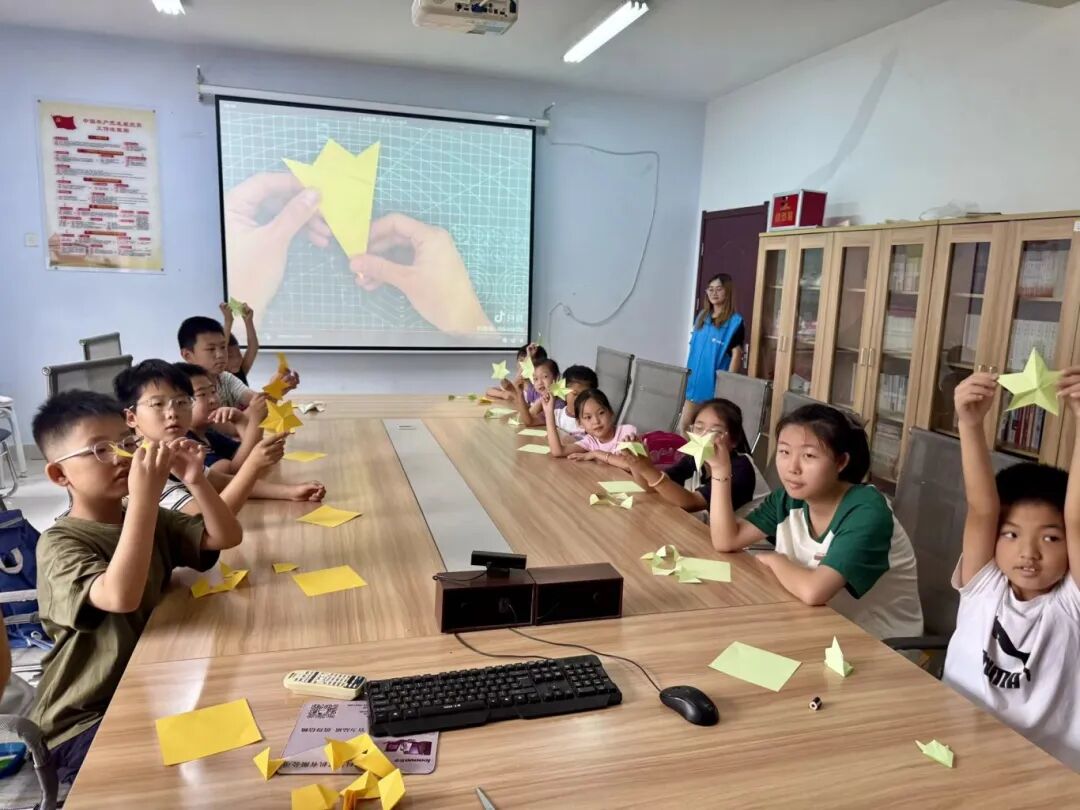 机器人展示后,五角星剪纸环节更添温情。我手把手教孩子们折纸、翻剪,纸在小手中翻转,偶尔有人剪歪了角,急得快哭了,我便蹲下来告诉他们:“没关系,就像当年科学家们研究导弹时也失败过很多次,但他们从来没放弃呀。”当孩子们举着自己剪的五角星欢呼时,我忽然明白,这一颗颗稚嫩的星星,正是红色基因传承的模样。有个小男孩把剪好的五角星塞给我:“姐姐,这个送给你,它像国旗上的星星一样亮。”那一刻,我真切体会到,我们传递的不仅是手工技巧,更是一份对国家与科学的热爱。