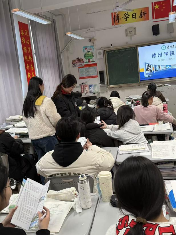 2.与高中老师见面后,我在老师带领下进入教室,向同学们发放德院招生宣传册并介绍学校情况。我分享了新生入学常见问题与适应建议,引导大家合理规划大学生活、积极参与校园事务。现场耐心解答疑问,帮助同学们明确发展方向,并通过小礼品激励大家勤奋学习、追逐理想。