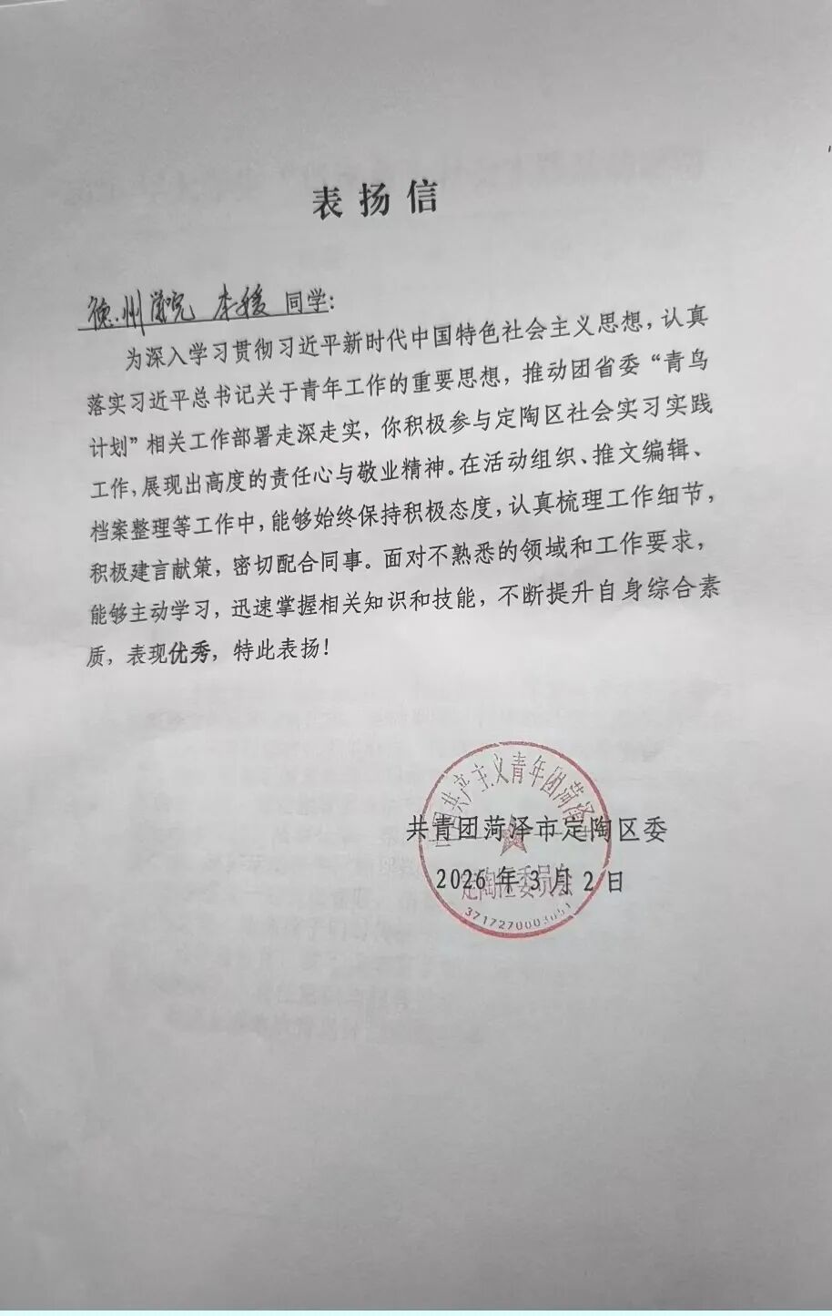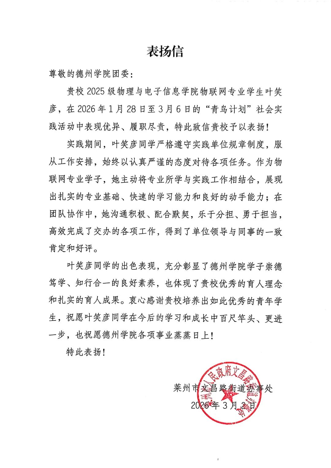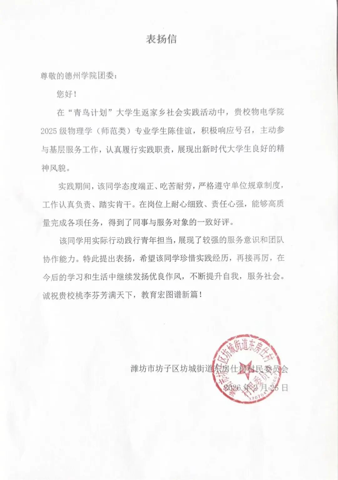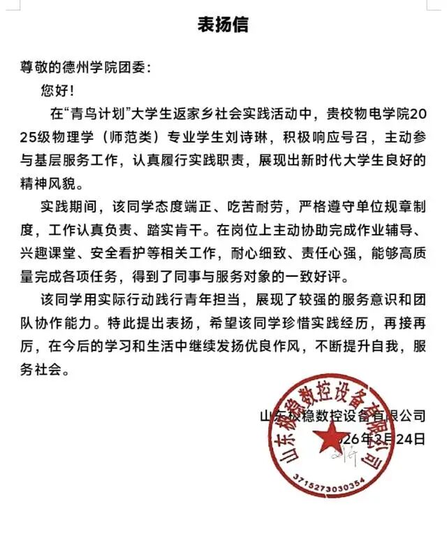 用实际行动贡献青春力量,于家乡热土书写青年担当。2026年寒假期间,永乐高60net广大青年学子积极参与“返家乡”社会实践活动。他们走进政府机关、社区、街道办事处等实习岗位,踊跃投身于科技创新、乡村振兴、绿色发展、社会服务等各领域各方面工作,在扎根基层实践、助力家乡发展中受锻炼、长才干、显担当。同学们在实践中的优异表现,获得了各实践单位的充分肯定,陆续收到多封感谢信。这些“暖心回应”的背后,是同学们实践成效与家乡发展需求的同频共振。