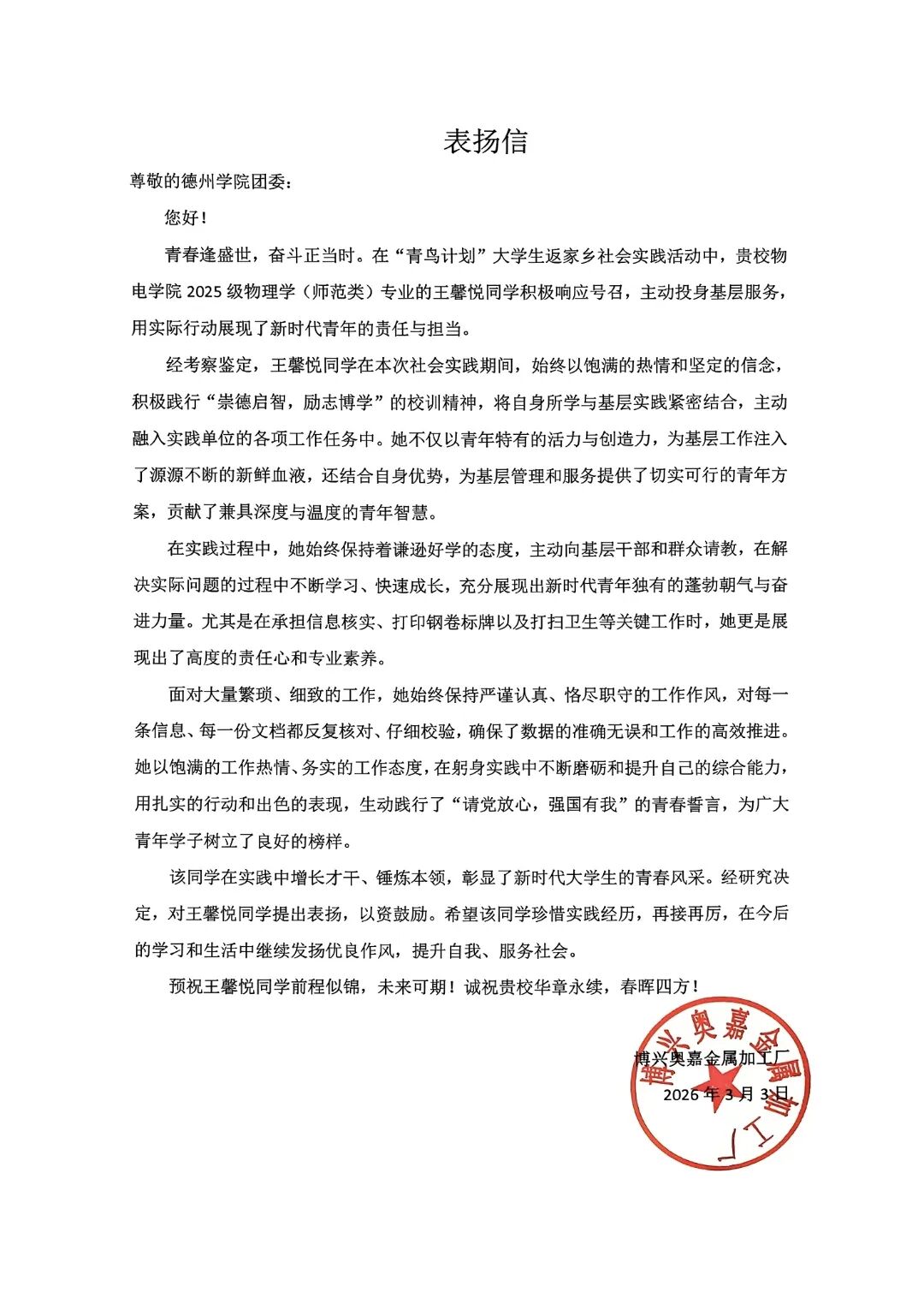 在博兴奥嘉金属加工厂的实践,是我从校园走向工业现场的一次深刻淬炼。轰鸣的机器、冷硬的金属板材,与安静的书桌形成强烈反差,让我真切触摸到了工业生产的脉搏。这段经历也让我意识到,物理中的应力分析、材料力学正是压花工艺的核心支撑,知识的价值最终要在实践中落地。