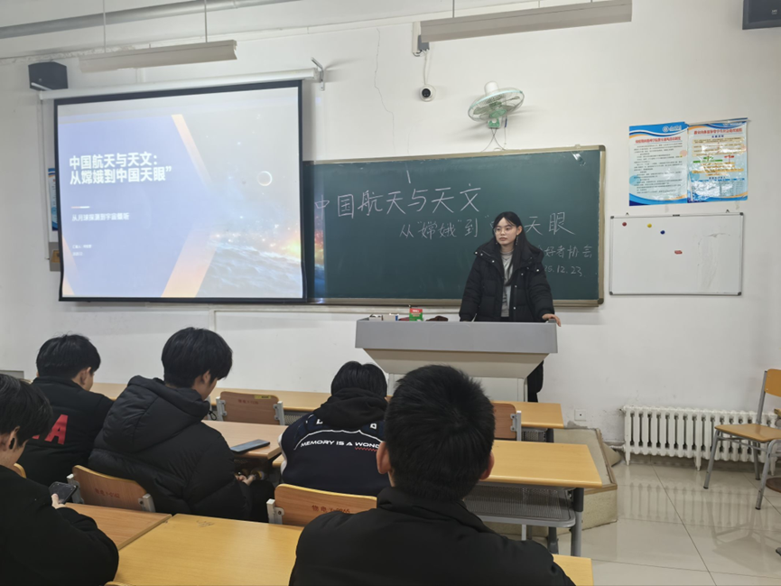 为普及天文与航天领域的前沿知识,激发学生对宇宙探索与空间科技的求知热情,12 月 23 日,物电学院天文爱好者协会在明理楼 223 教室举办 “星途逐梦,探索苍穹” 主题活动。