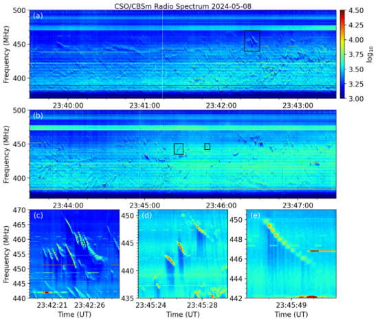 该研究利用国家重大科技基础设施项目--子午工程(“东半球空间环境地基综合监测子午链”,)二期(CMP-II)观测台站槎山米波射电频谱仪(CBSm),发现了一种新型的太阳射电暴频谱精细结构。主要特征有:周期性窄带条纹,出现周期约0.6 s;后随条纹出现于前面条纹结束之时;条纹通常从高频向低频漂移,常伴有吸收特征;条纹上有时会呈现周期在0.1 s的串珠结构,故称之为珠状条链。根据稻城圆环阵太阳射电成像望远镜(DART)数据,可知射电辐射亮温超过10^9 K,源区位于活动区AR 13664东南侧、持续增亮冕环结构的斜上方。研究团队提议,周期条纹结构是由等离子体双共振(DPR)不稳定性所激发的多谐频高杂波引起的,其上串珠结构则归因于低频MHD波对背景磁场或等离子体密度的调制作用。该现象展现了CBSm的高分辨太阳射电暴频谱精细结构的探测能力,结合DART的印证与互补信息,对于理解太阳射电暴辐射机制与源区特征具有重要意义。