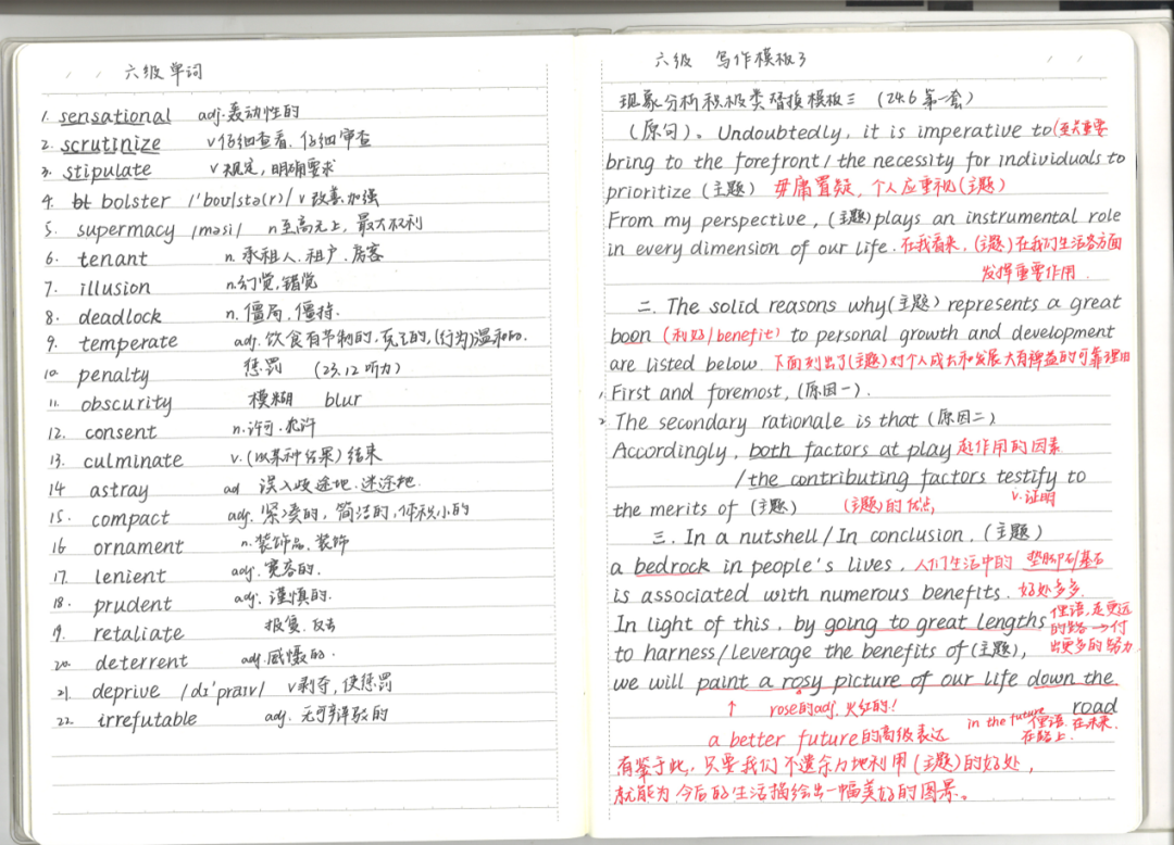 近年四六级作文以议论文为主,一定要逻辑结构清晰,可以适当背诵一些模板。我最近在听的一个b站up主:Zachary的英语视界,他的写作模板特别好,也会教如何使用模板和写论据的思路。书写美观是加分项哦,可以练字帖提高书写。